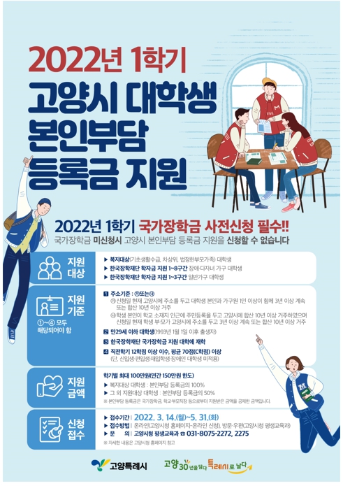 2022년 1학기 고양시 대학생 본인부담 등록금 지원 사업 안내